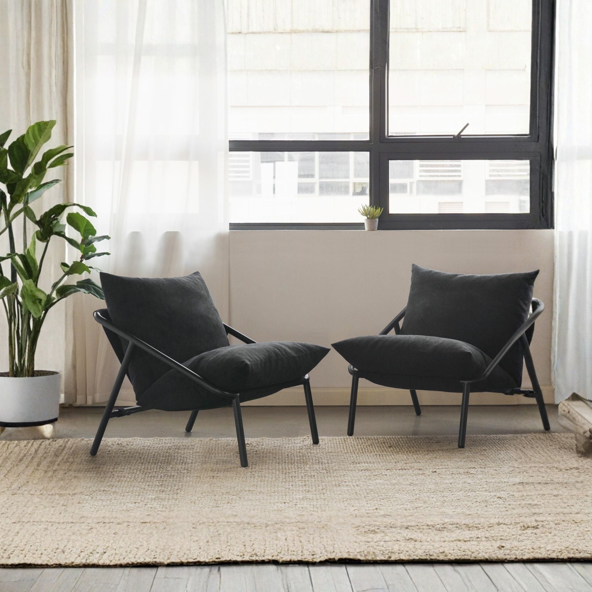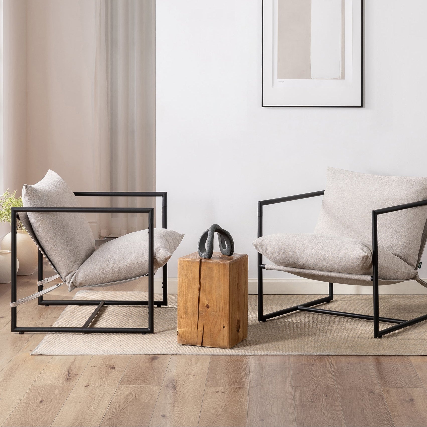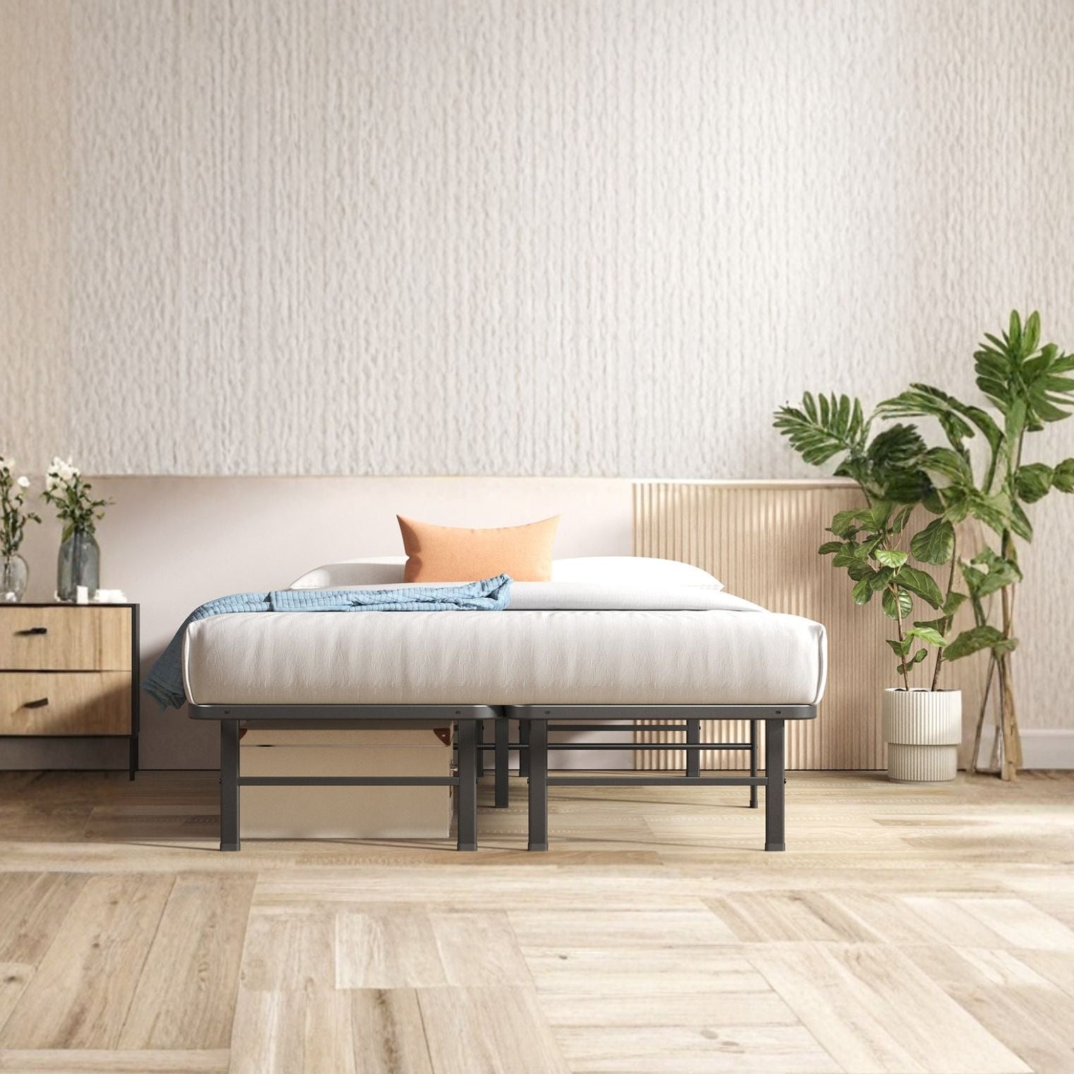 Dormitorio moderno rústico con base de cama de metal negro, ropa de cama blanca, manta color arena y cojines neutros;...
